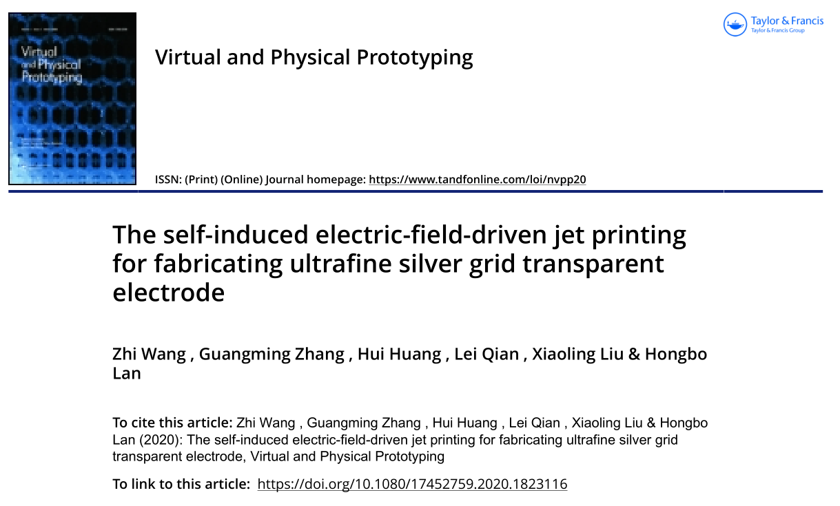 近日,yl88858永利官网、山东省增材制造工程技术研究中心的机械工程专业2018级研究生王智以第一作者、青岛理工大学第一单位在国际权威期刊《Virtual and Physical Prototyping》发表题为《The self-induced electric-field-driven jet printing for fabricating ultrafine silver grid transparent electrode》的研究论文,指导教师为张广明副教授。