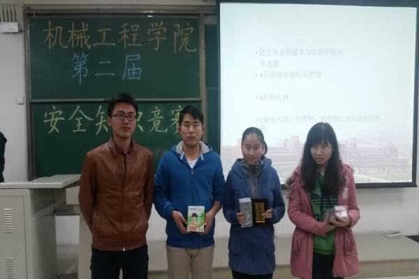 本次活动于4月10日在嘉陵江路校区二食堂门口举行了“问卷调查签名”活动,并开展安全知识竞答报名,同学们踊跃参加,报名现场热情高涨。4月12日晚在嘉陵江路校区主教学楼B320举办的“安全知识竞答”比赛现场更是气氛热烈,同学们积极抢答,各抒己见,使校园安全知识得到广泛普及。活动最后,一等奖由材料141班获得,二等奖由安全121班获得,三等奖由机械141班获得,出席本次活动的嘉宾为获奖集体颁奖并合影,本次“以我安全之心,换我校园和谐”为主题的安全月活动圆满结束。