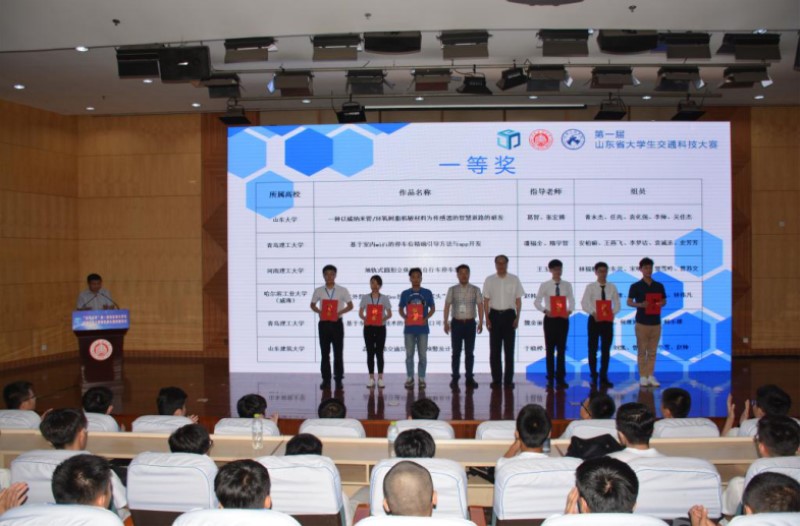 本次大赛共有16所高校的52件作品参加决赛,经过现场答辩,专家评审,共评出一等奖6项,二等奖14项,三等奖21项,优秀奖11项。我校参赛作品《基于室内wifi的停车位精确引导与APP开发》(作者:安柏硕、王燕飞、李梦洁、袁诚丞、史芳芳指导老师:潘福全隋学智)及《基于车路协同的信控交叉口可升降减速带设计》(作者:郑甜甜、何继旭、白坤、韩乐潍 指导老师:魏金丽杨金顺)在决赛中取得了一等奖的优异成绩;《基于红外激光扫描定位技术的道路交通事故实时监测及预警系统》(作者:周海洋、朱南、张海军、郑灵欢、李可萌指导老师:刘桂丽陈秀峰)及《多功能埋地式太阳能红绿灯》(作者:李乾、于明君、贾延森、孙宏图、曲少璐指导老师:王中帅)获得二等奖。本届大赛以“绿色·智慧·共享”交通为主题,旨在实现以“绿色循环、低碳交通、”为主题的服务理念。大赛聚集了交通领域的不同方向的专家学者,凝聚了社会各界力量与有识之士,推动企业与高校在人才培养、学科建设、实习基地建设、科学研究等方面 实现了“合作共赢”。