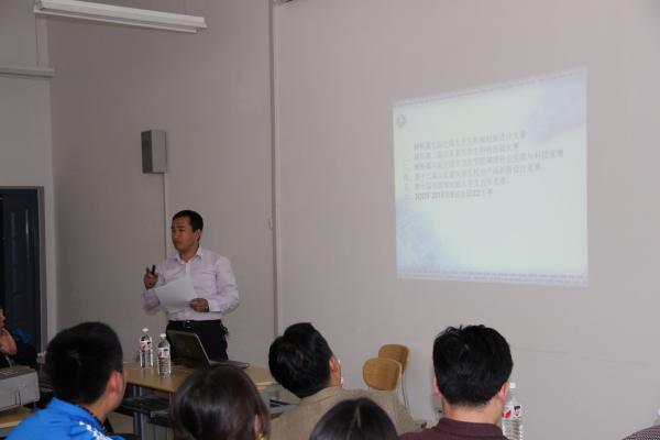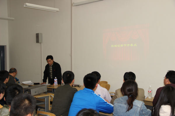 李院长在开幕式中详细说明了机电创新大赛的准备工作及报名须知等事宜,鼓励同学们积极的参与到科技创新中来。随后机械学院团总支书记贺治成介绍了在历届机械创新大赛中的获奖作品以及同学们可以参加的国家级、省级比赛。紧接着,谭继文教授发表讲话,他指出大学生参加科技创新竞赛对提高大学生科技创新意识与能力、促进大学生就业成才具有重要作用,同时提醒在同学们参加科技创新竞赛是比起争取名次更应该注重比赛的过程,并鼓励我院师生在各项活动中再接再厉、勇于创新。
