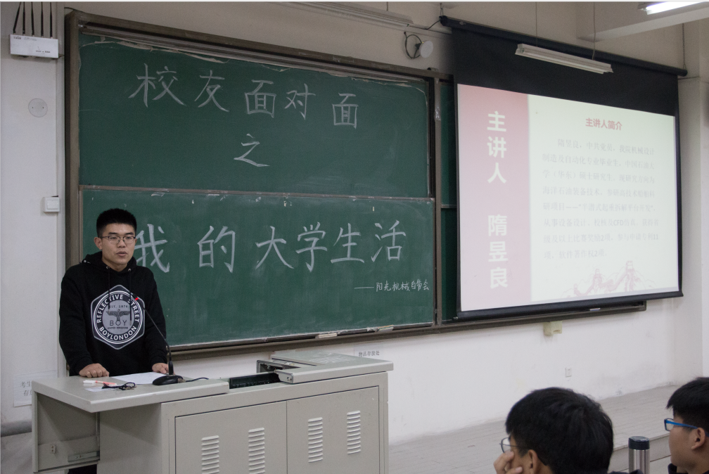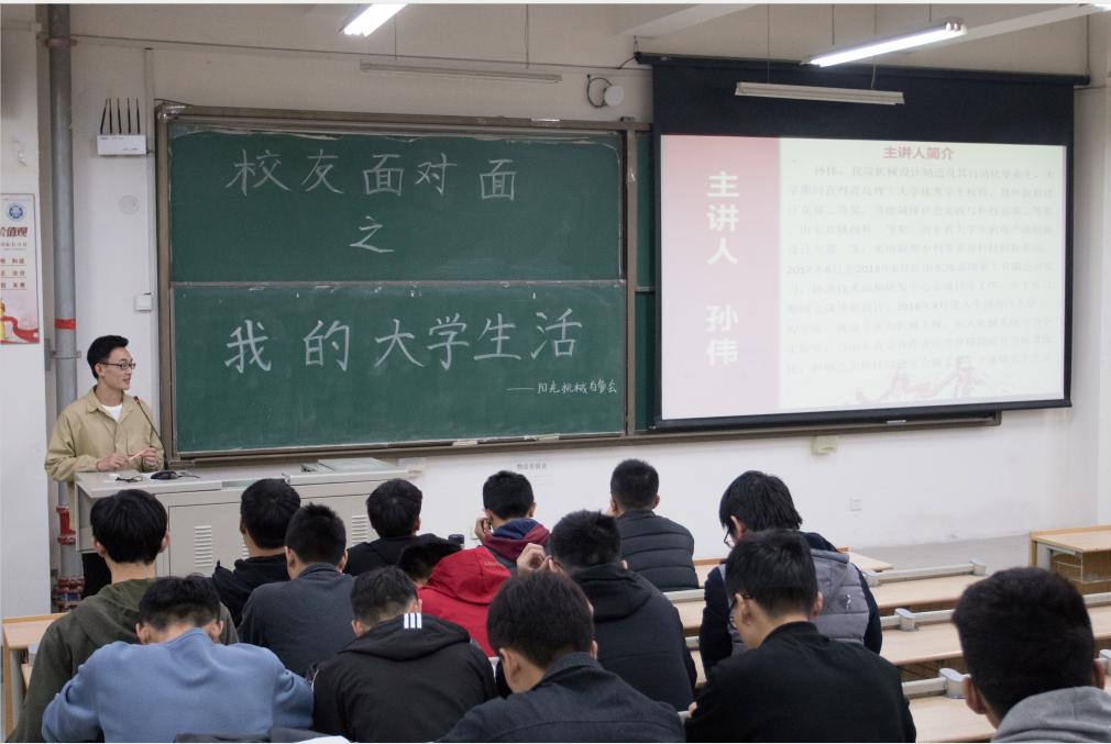 为更好的推进“精英培育计划”,促进学生学业、职业发展,助力学生实现梦想,11月24日下午,yl88858永利官网在B135教室举办了以“我的大学生活“为主题的”卓越校友面对面“分享会。此次分享会由2014级校友隋昱良和孙伟主讲,2018级辅导员徐卫晓及200多名机械专业的学生参加此次分享会。