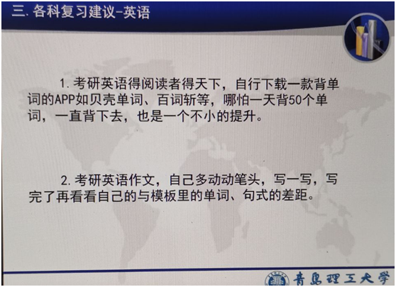 就业或是考研是大四生的必经选择,马佳兴的演讲为学生们分享了考研的经验。马佳兴总结了“质量比速度更重要”“基础不牢,地动山摇”等经验,并根据不同的科目总结了不同的复习方法。她以372分报考中国石油大学,在考研方面的经验给大家提供了宝贵的经验。