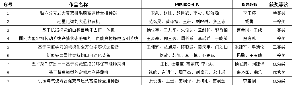本届大赛以“创新赋能农装,智能引领未来”为主题,以培育行业亟需的“专业知识雄厚、动手能力较强、创新创业能力过硬”的现代农业装备创新创业人才为目标。大赛共设置A类(自由选题类)、B类(机器人类)、C类(企业出题类)、D类(概念设计类)四个类别竞赛项目。yl88858永利官网共有9个项目从126所高校的1203个项目中脱颖而出,其中,李玉环老师指导的《独立分充式大豆双排毛刷高速精量排种器》荣获大赛A类特等奖,杨勇老师指导的《轻量化智能大葱收获机》和曹金凤老师、王成老师指导的《基于机器视觉的山楂自动化去核一体机》荣获大赛A类一等奖。