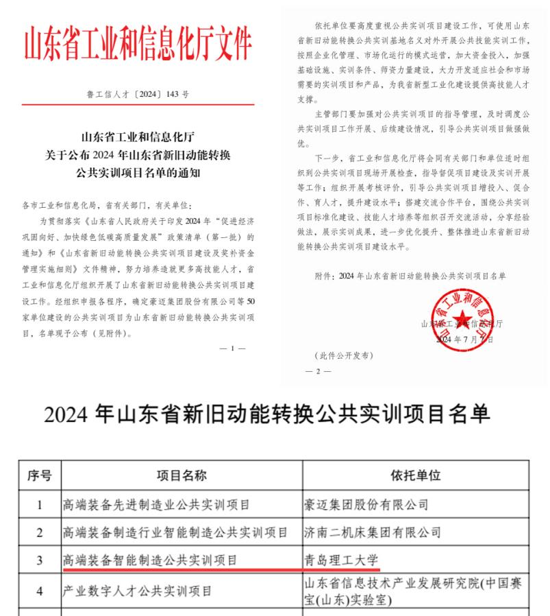 近日,山东省工业和信息化厅下发了《关于公布2024年山东省新旧动能转换公共实训项目名单的通知》,我校申报的“高端装备智能制造公共实训项目”成功入选,这是我校首次获得该类型项目支持。