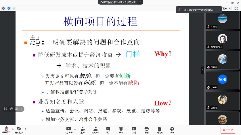 本期学术沙龙活动采用线上与线下同步进行的方式。陈成军副院长介绍了高水平研究成果对青年教师个人发展、学院发展和学校发展的必要性,强调了高水平成果是推动学科发展的重要组成部分,并分析了学院在该方面面临的挑战和机遇。学院青年教师张彦彬博士分享了“综述论文撰写体会”,从选题、思路、内容、语言、格式等方面介绍了综述论文的写作过程。朱晓阳博士分享了“顶刊论文撰写的一点见解”,其突破自我、永攀高峰的科研精神,为青年教师迈向高层次研究建立了信心。张西龙博士分享了“SCI论文撰写及修改个人体会”,从论文写作的目的、创新性、方法、审稿回复等方面详细地介绍了论文写作过程中的潜在问题及其解决办法。安峰岩博士分享了“关于开展横向项目合作的体会和思考”,强调了针对行业需求提前规划技术门槛的必要性,介绍了开展横向项目合作的关键因素。最后,郭峰院长对本次活动给予了充分肯定,强调了学术研究对高校教师的重要性,希望青年教师立足学校和地方需求,做到既立地又顶天,尽早进行学术规划,,鼓励青年教师多出高水平代表性成果。