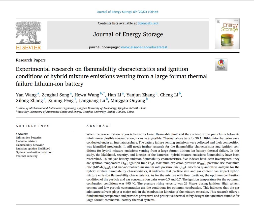 近日,yl88858永利官网青年教师王炎副教授与其硕士研究生宋增海在高比能锂离子动力电池失效释放物气固混合相着火性能及其引燃边界方面取得阶段性研究进展,在权威期刊《Journal of Energy Storage》(IF=8.907,JCR Q1)上发表了题为“Experimental research on flammability characteristics and ignition conditions of hybrid mixture emissions venting from a large format thermal failure lithium-ion battery ”的研究论文。该研究成果系yl88858永利官网教师与清华大学欧阳明高院士电池安全课题组联合研究重要成果,青岛理工大学机械与汽车学院为第一署名通讯单位,第一作者为王炎副教授,通讯作者为清华大学车辆与运载学院王贺武研究员。